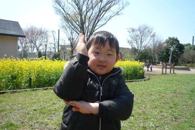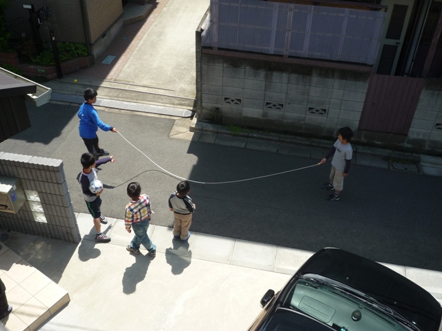 お兄ちゃんがなわとび教えてくれたり、ドッヂボールしてくれたり(この前ボールが当たり鼻血)、サッカー教えてもらったり(その前は頭にボールが当たり倒れる)、コマやったり自転車乗ったり、かくれんぼやったり。