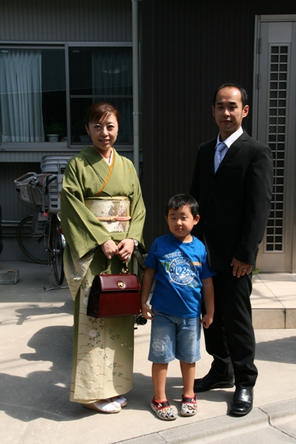 でもせっかくだからと、暑いけど玄関前で記念撮影をば。
