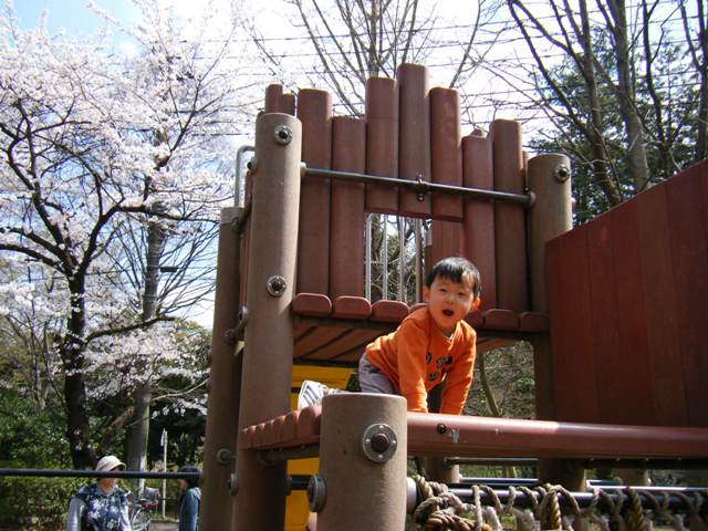 あまりに延々と砂場で遊び続けるし、別の公園の桜も見ようという事で、次は別の公園へ移動。