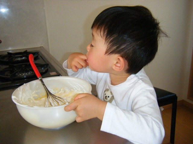 『混ぜ混ぜしてね♪』と言ったら、混ぜるんだけどすぐに味見ばっかり(⌒▽⌒)