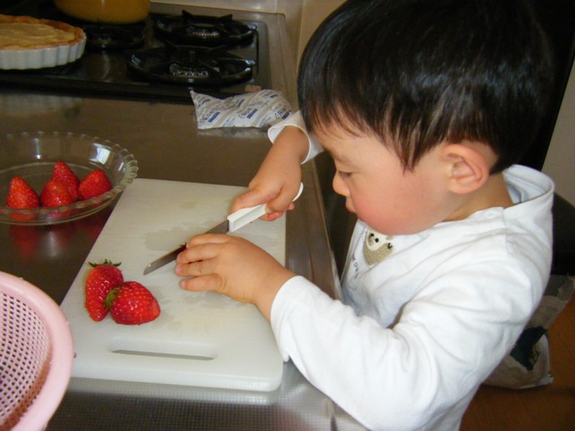 いちごを切ってもらったけど、危なっかしいったら!! でも数個は頑張って1人で切りました♪