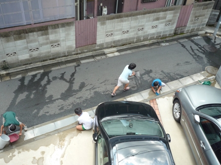 バケツでお水を流したのを『ちりとり』でせきとめるんだって。