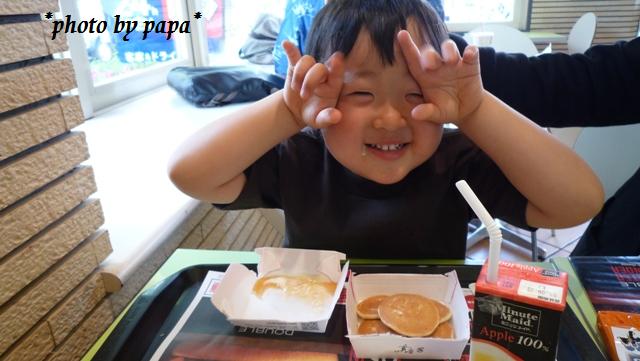 この日マックでハッピーセット(チーズバーガー&スイートコーン&ジュース、そして私のポテト3分の1)を食べてからすぐに、ミニパンケーキを平らげ。