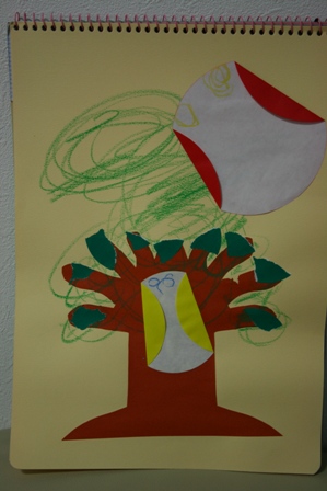 御丁寧に緑の折り紙をちぎり、木の枝に1枚1枚貼り付けておりました。