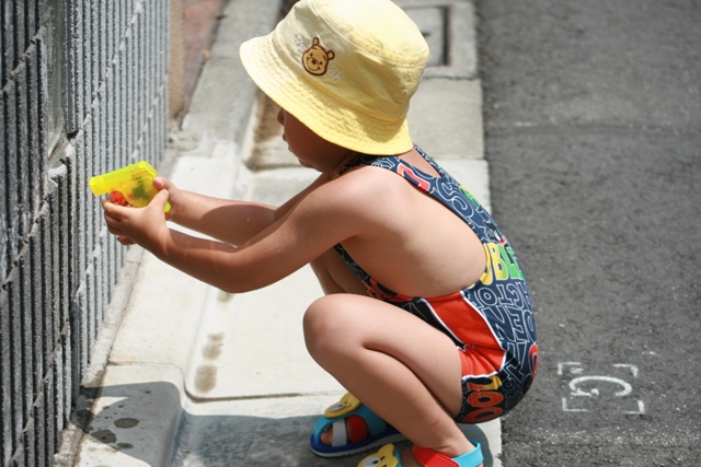 再び「ママも水鉄砲やって!!」と強要。 (なんで私が水鉄砲…。)
