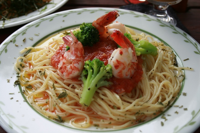 えーと、勧められたサラダ(白身魚をチーズ衣で焼いたものがのってます。めちゃ美味しかった!!)と、これまた一番人気だと勧められたトマトソースのパスタ。