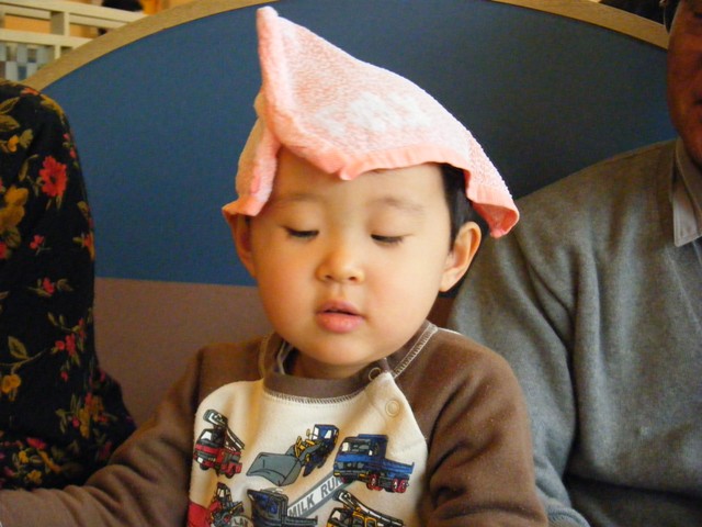 この日も雨だったので、ばあばが「少しは外に連れ出さないと、家が壊れちゃうわ!!」と、じいじ&ばあばと一緒にランチへ出掛けました。(救いの神~♪♪♪)