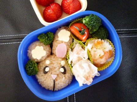 おかずが入るまでは結構イイ感じだったんだけど。(海苔で作った髪型が)